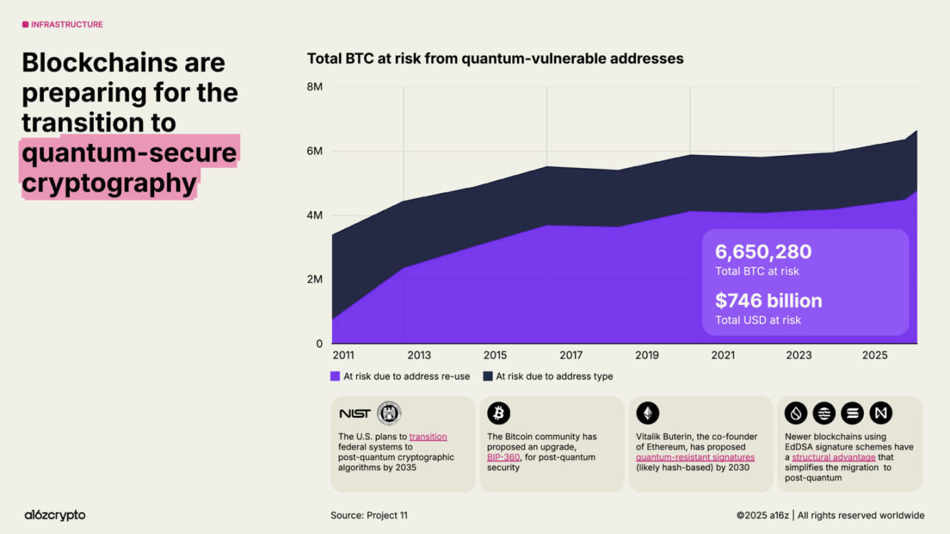 与此同时,区块链正加速推进「后量子计算」准备工作。目前,约 7500 亿美元的比特币存储在易受未来量子攻击的地址中;美国政府计划在 2035 年前,将联邦系统迁移至后量子加密算法。