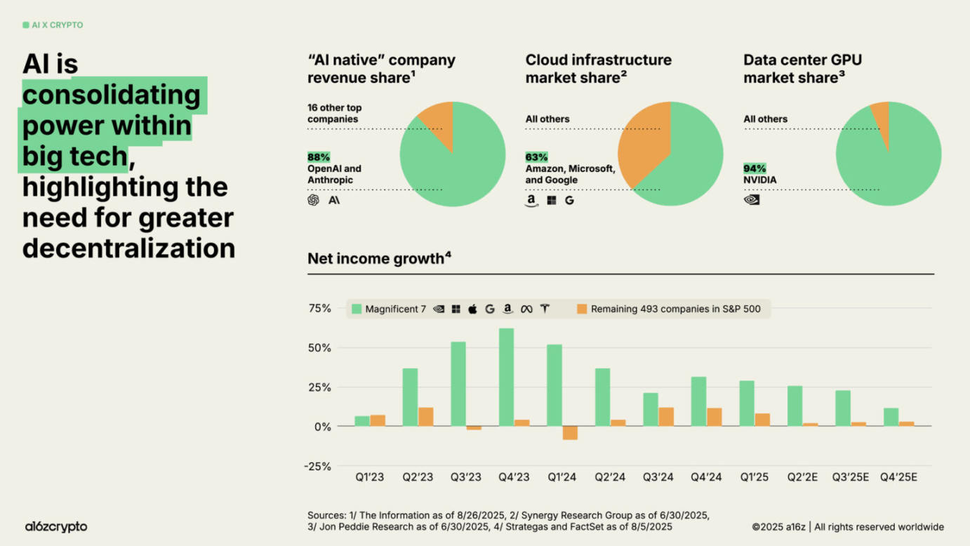 当前,AI 的计算层正逐渐向少数科技巨头集中,引发「中心化」与「审查风险」担忧。OpenAI 和 Anthropic 两家公司控制着「人工智能原生」公司 88% 的收入。亚马逊、微软和谷歌控制着 63% 的云基础设施市场,而英伟达则占据了 94% 的数据中心 GPU 市场。这些失衡推动了「七巨头」在过去几年中实现了两位数的季度净收入增长,而标普其余 493 家公司的整体盈利增长却未能跑赢通胀。