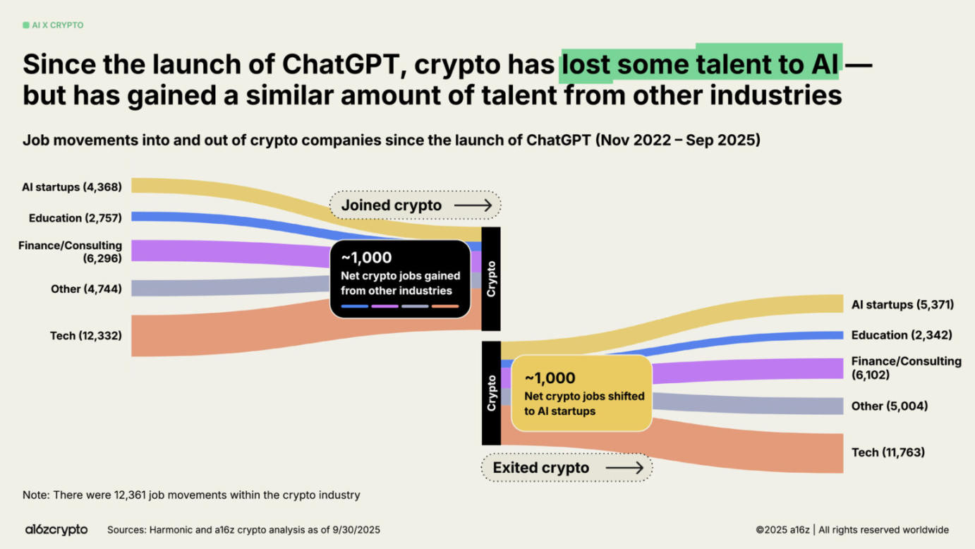 在人工智能热潮的带动下,一些开发者放弃了加密货币领域。我们的分析表明,自 ChatGPT 推出以来,约有 1,000 个工作岗位从加密货币领域转向了人工智能。但这一数字被同样数量的开发者从其他领域(例如传统金融和科技)加入加密货币领域所抵消。