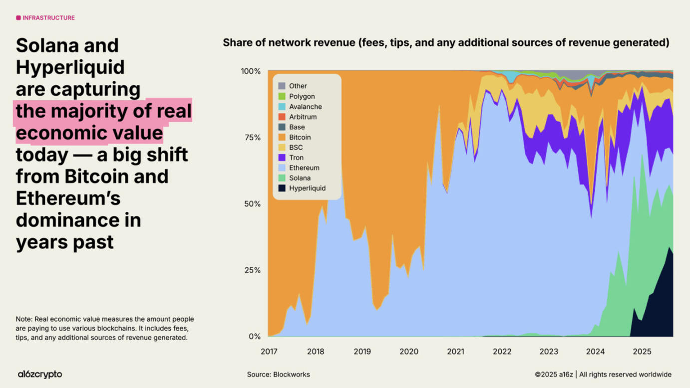 随着区块链持续扩容、手续费市场成熟及新应用涌现,实际经济价值(衡量用户为使用区块链支付的真实成本)成为更重要的指标。目前,Hyperliquid 与 Solana 贡献了 53% 的创收型经济活动—— 这与前几年比特币与以太坊主导市场的格局形成显著差异。