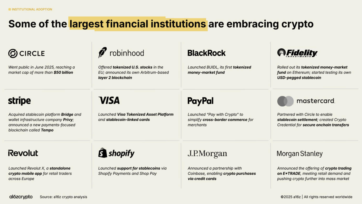 2025 年是加密货币机构采用元年。去年的《加密货币现状报告》提出「稳定币已找到产品市场契合点(PMF)」仅五天后,Stripe 便宣布计划收购稳定币基础设施平台 Bridge。行业竞赛正式拉开帷幕,传统金融机构也纷纷跟进,公开布局稳定币领域。