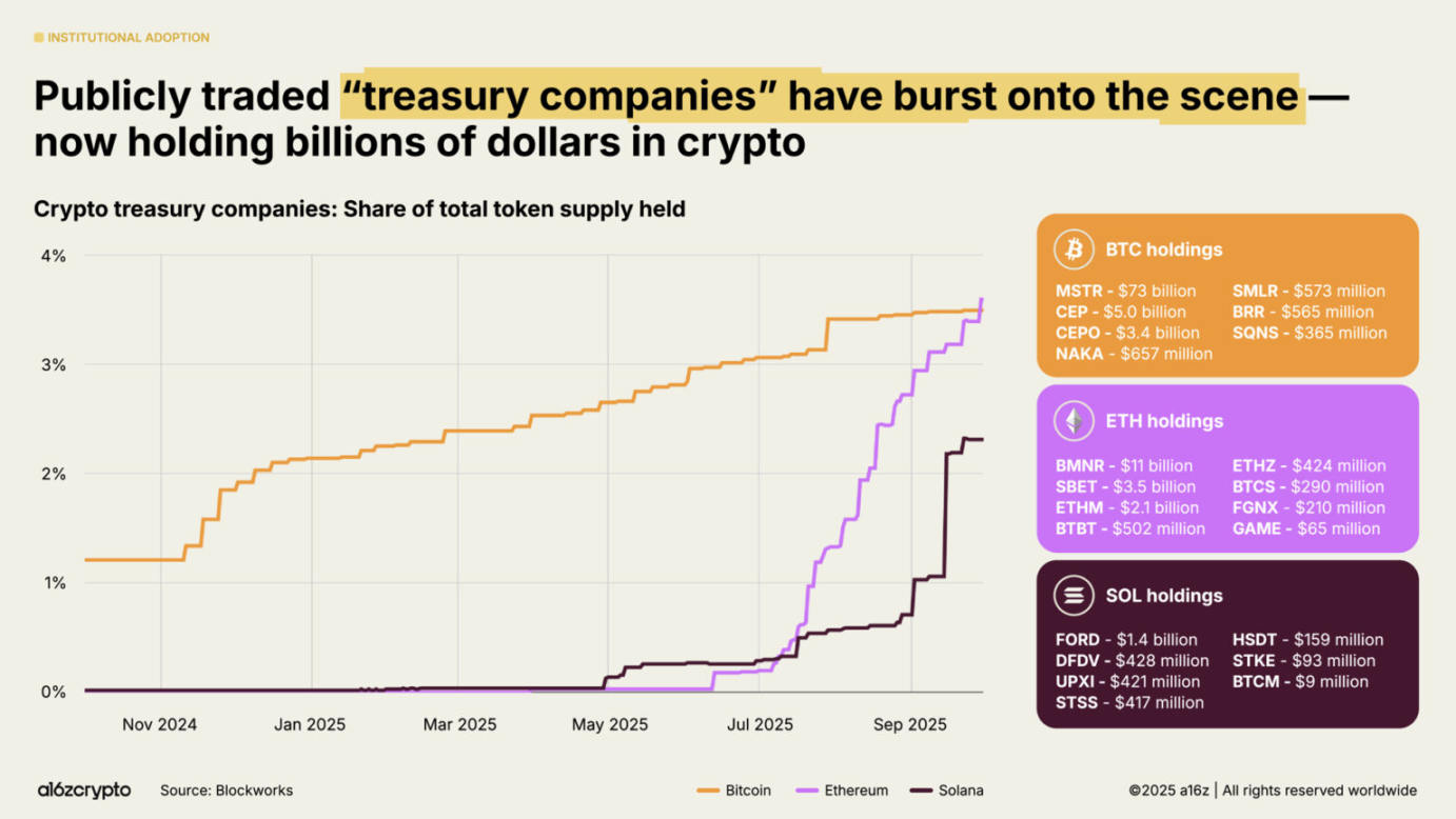公开交易的数字资产库(DAT)公司目前总共持有比特币和以太坊流通总量的约 4%。这些 DAT 加上交易所交易产品,目前持有比特币和以太坊代币供应量的约 10%。