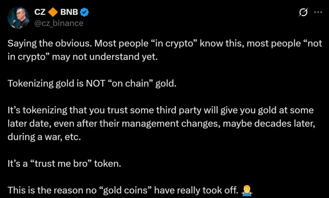 这是一个细微却本质的差别,其中 BTC 完全从 0 创造出信任,而代币化黄金则把传统的信任结构数字化,就像 CZ 最新发推直言: