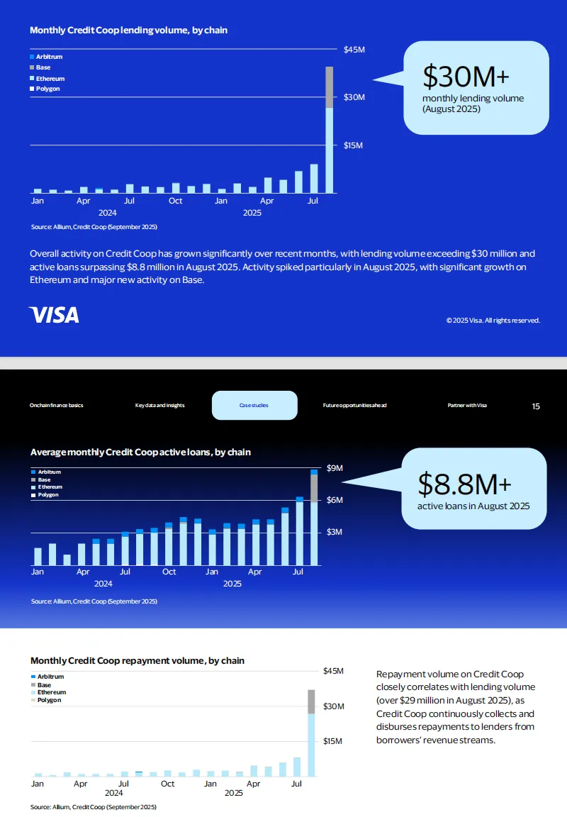 整体来看,Credit Coop 近几个月业务量显著攀升:2025 年 8 月放贷额超 3,000 万美元,未偿贷款余额突破 880 万美元;尤其 8 月出现激增,以太坊上规模扩大,Base 链亦开始贡献主要新增量。