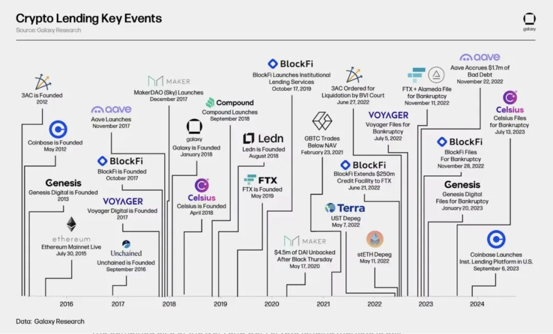 尽管链上和链下加密借贷直到 2019 年底/2020 年初才被广泛使用,但一些当前和历史上重要的参与者早在 2012 年就已成立。其中,Genesis 尤其值得关注,其贷款规模曾高达 146 亿美元,成立于 2013 年。像 Aave、Sky(原 MakerDAO)和 Compound Finance 这样的链上借贷巨头,于 2017 年至 2018 年在以太坊上推出。这些链上借贷/借贷解决方案的出现,得益于以太坊和智能合约的诞生,而以太坊和智能合约于 2015 年 7 月正式上线。