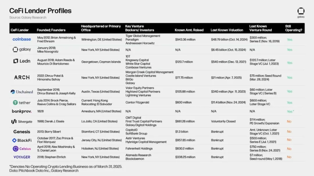 下图对比了历史上一些规模最大的 CeFi 加密贷款机构。部分公司为投资者提供多种服务,例如 Coinbase,其主要业务是交易所,但也通过场外加密货币贷款和保证金融资向投资者提供信贷服务。