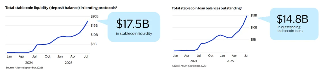 当与稳定币结合时,这些协议能够以自动执行、接近即时结算,以及无国界资金流动的方式实现新的借贷模式——本质上打造了一个永不关门的全球信贷市场。