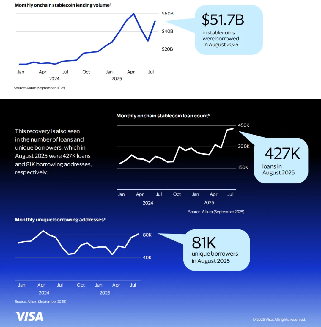 全球链上借贷市场正在快速扩张,2025 年 8 月月度规模达到 517 亿美元,活跃借款人超过 8.1 万,显示出稳定币驱动信贷市场的体量与增速。