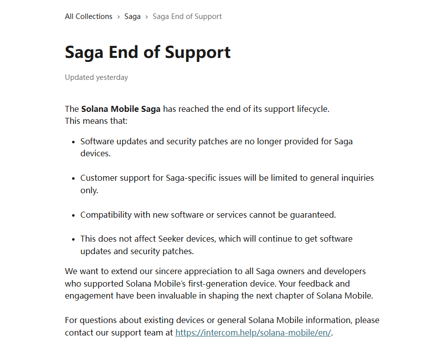 然而,这一商业决策的直接后果,由那 2 万名 Saga 用户承担。Solana Mobile 宣布停止所有软件更新和安全补丁,意味着这些设备将永久停留在 2024 年 11 月的最后一个安全版本上 。