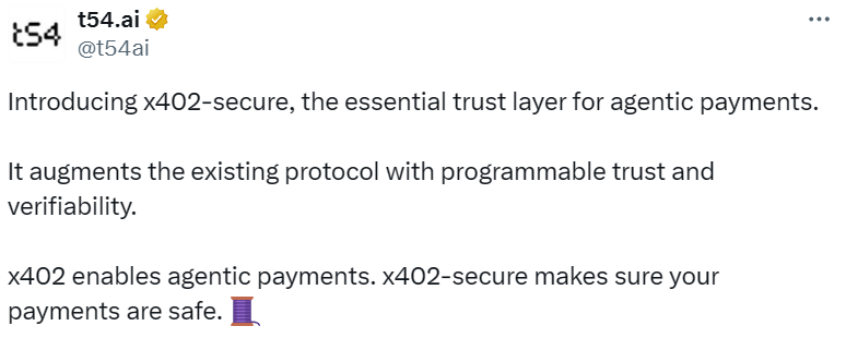- t54.ai 推出 x402-secure,为 x402 协议添加可编程信任层