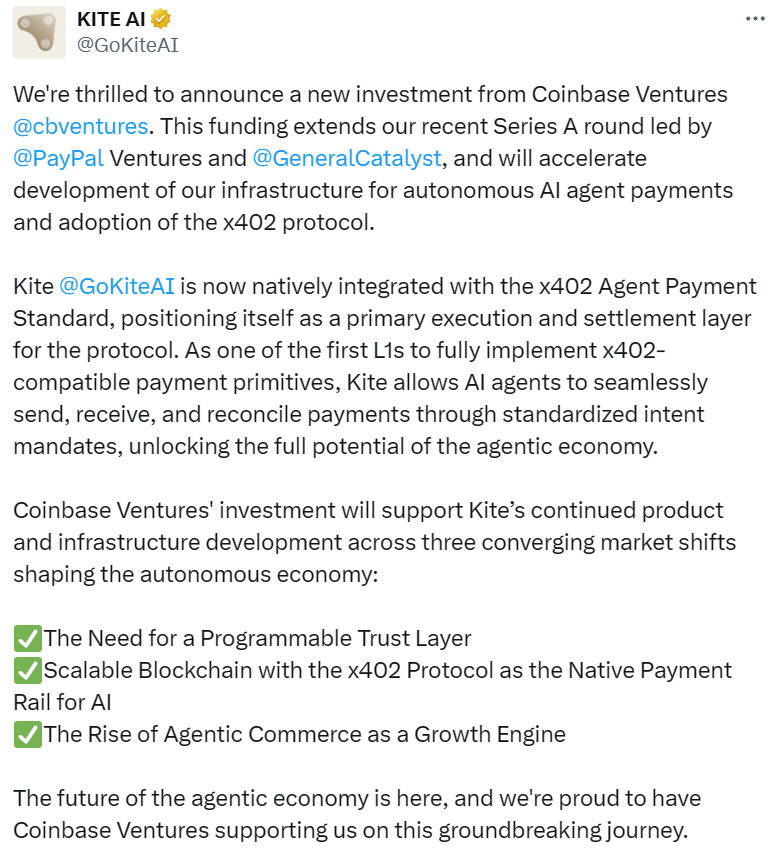 - AI 支付公链 Kite AI 获 Coinbase Ventures 战略投资,推进 x402 智能体支付大规模采用