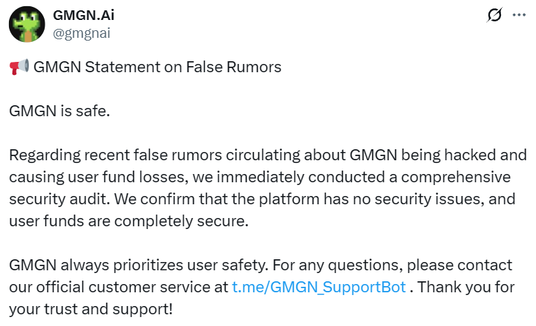- GMGN 回应被盗传闻:平台不存在任何安全问题,用户资金安全