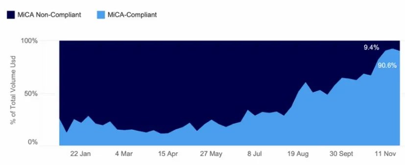 正如图所示,到 11 月中旬,MiCA 合规加密资产已占据总交易量的 90.6%,而非合规加密资产仅剩 9.4%。这一数据变化直观反映了市场对监管要求的快速响应与适应。