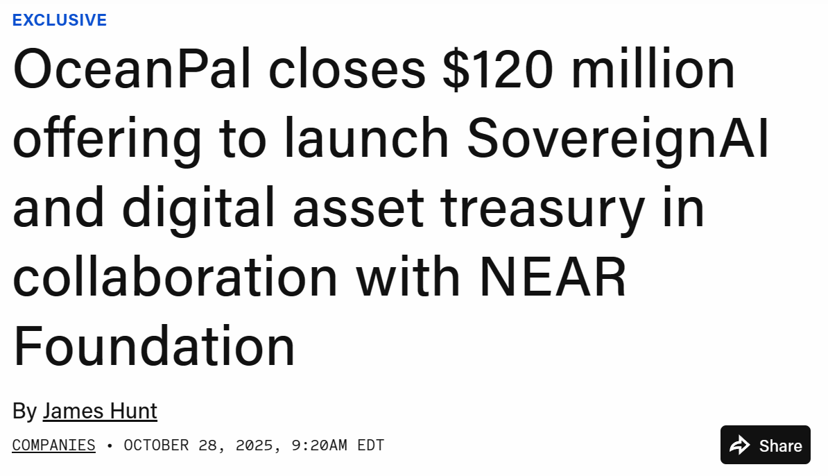 - 航运公司 OceanPal 完成 1.2 亿美元融资,推出基于 NEAR 协议的 AI 项目