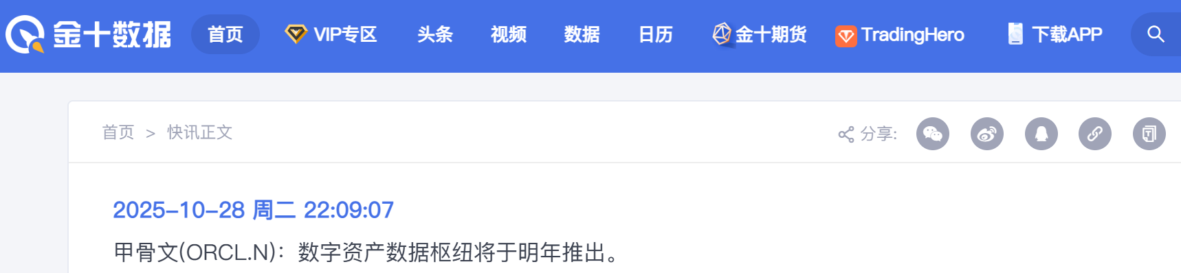 - 甲骨文:数字资产数据枢纽将于明年推出