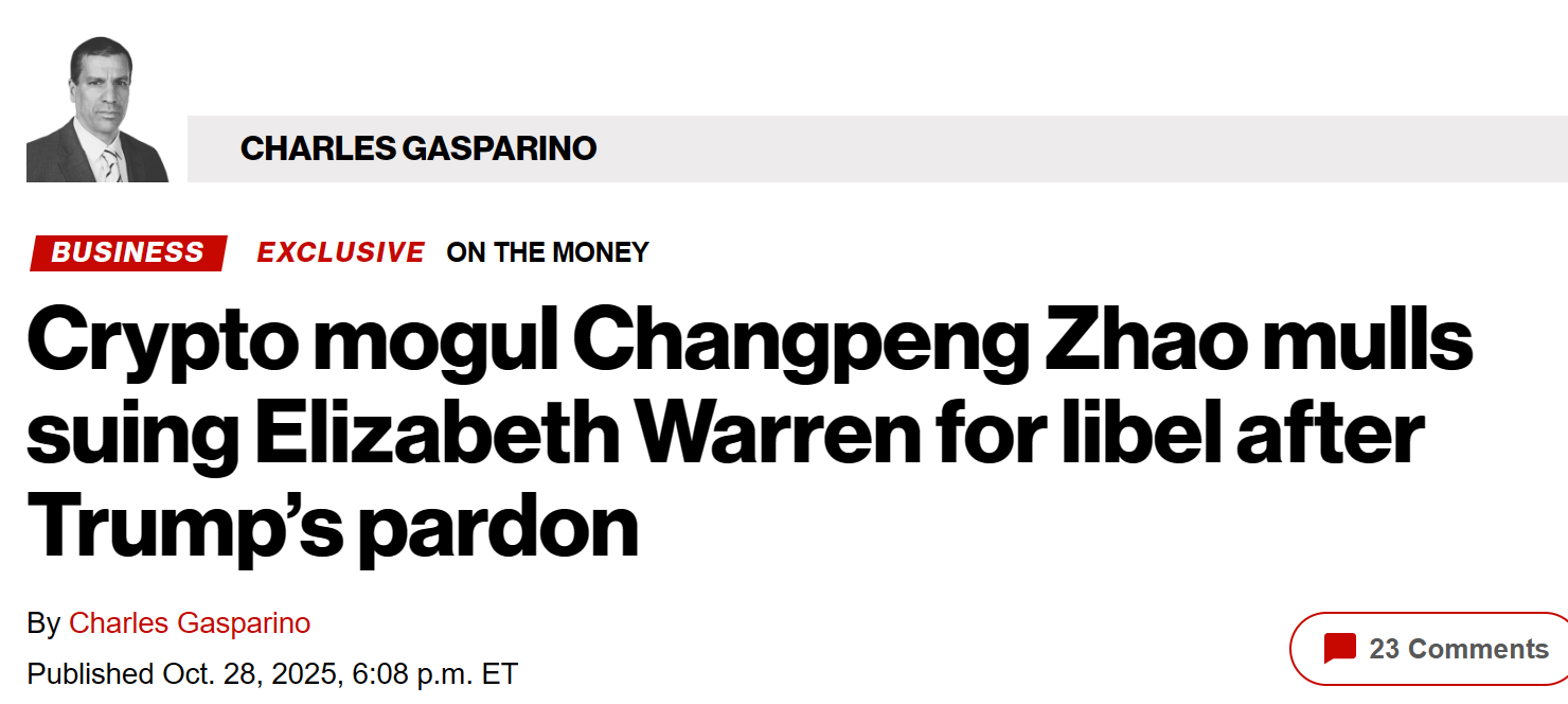 - 赵长鹏拟对美国议员 Elizabeth Warren 提起诽谤诉讼
