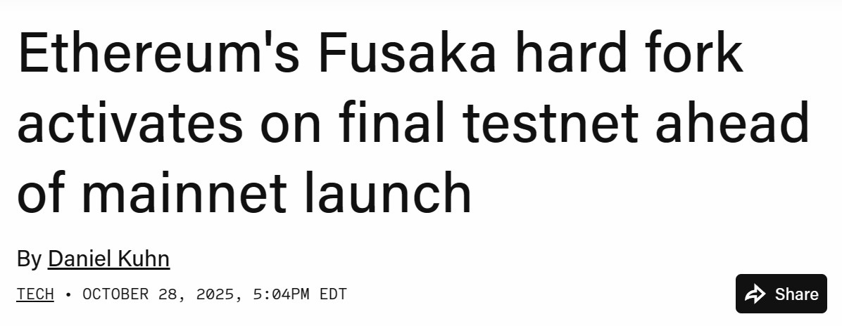 - Fusaka 升级完成最终测试,拟于 12 月 3 日左右在主网上线
