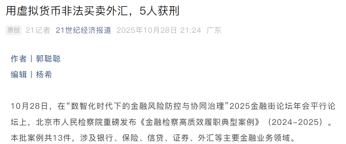 - 北京检察院发布 USDT 跨境非法外汇交易案例,涉案超 11 亿元,5 人获刑