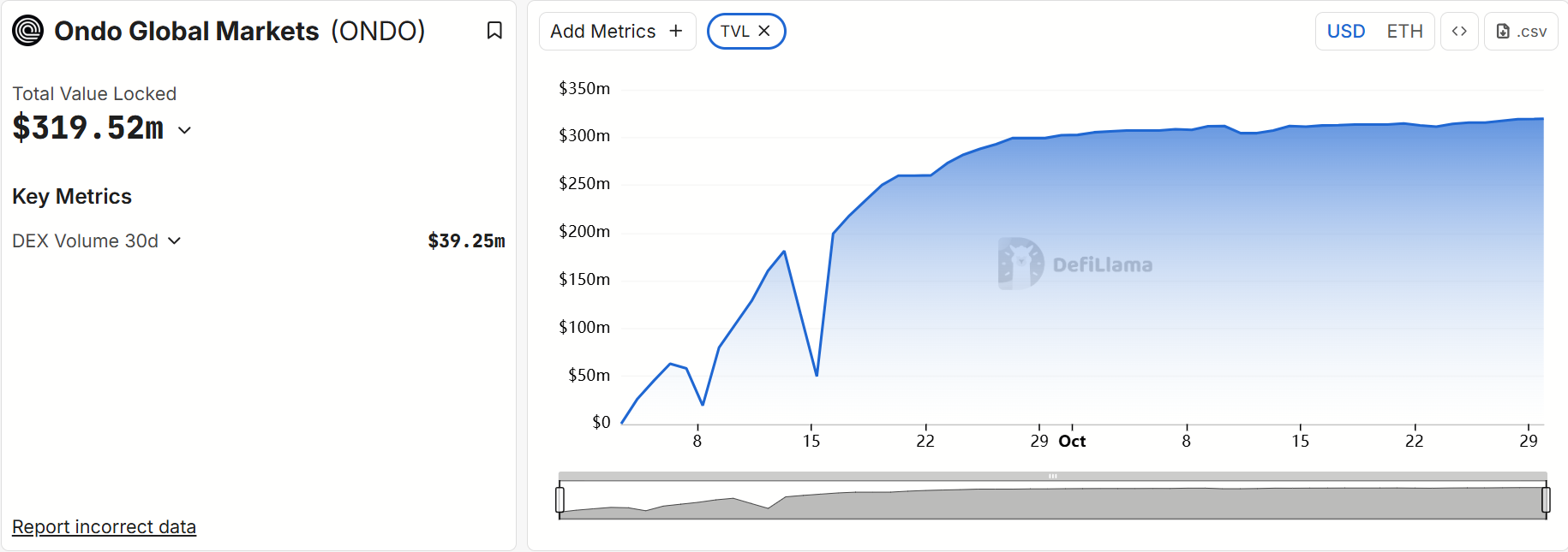 据 defillama.com 数据显示,OGM 上线仅 9 周,其锁定资产规模(TVL)便攀升至 3.2 亿美元,累计链上交易额突破 6.69 亿美元,支持超过 100 种代币化美股或 ETF,包括 SPY、Apple、Tesla、NVIDIA、QQQ 等最具代表性的资产。