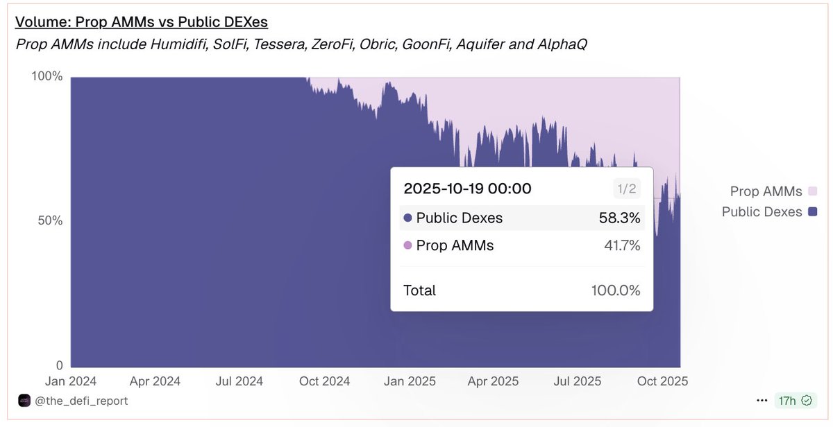 专业自动做市商(Proprietary AMMs,简称 Prop AMMs)正在迅速成为 Solana DeFi 生态中的主导力量,目前它们已经贡献了主要交易对中超过 40% 的交易量。这类由专业做市商运营的专门流动性场所,能够提供深度流动性和更具竞争力的定价,核心原因在于它们显著降低了做市商被利用 “过期报价”(stale quotes)进行抢跑(front-running)套利的风险。