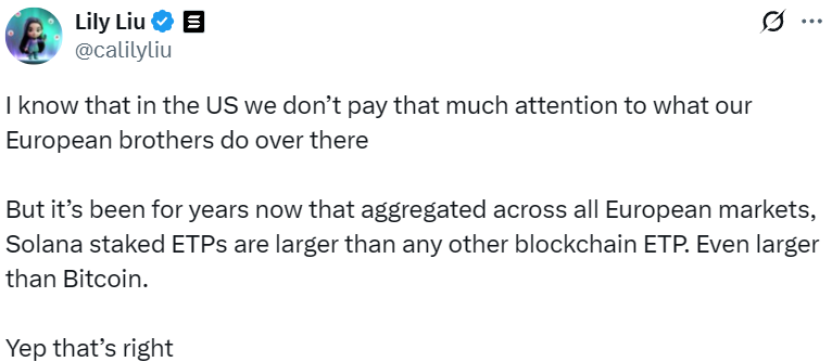 - Lily Liu:Solana 质押 ETP 欧洲市场规模已超越其他区块链 ETP