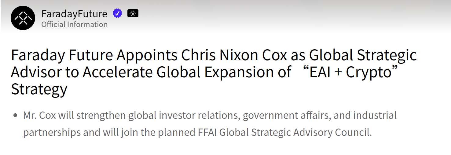 - 法拉第未来任命 Chris Nixon Cox 为战略顾问