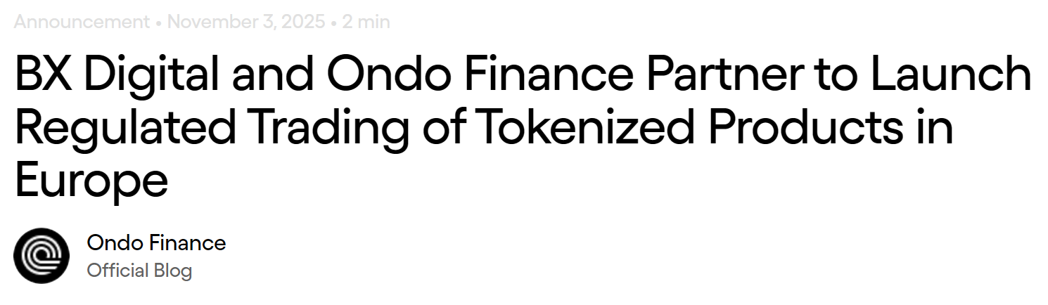 - Ondo Finance 与 BX Digital 达成合作,在欧洲推出 Ondo 代币化股票和 ETF 交易