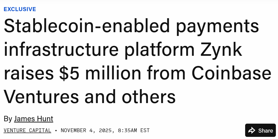 - 稳定币跨境支付基础设施平台 Zynk 宣布完成 500 万美元种子轮融资,由 Hivemind Capital 领投