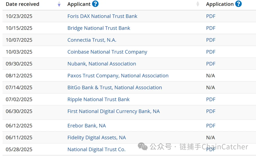 二是美国银行牌照申请,Ripple 于 2025 年 7 月 2 日 向美国货币监理署(OCC)提交设立 Ripple National Trust Bank 的申请,目前处于 120 天法定审查期,最晚将于 2026 年 11 月 2 日 前出初步结果。根据 OCC 官网最新状态,Circle (First National Digital Currency Bank)于 6 月 30 日申请,已超 120 天审查期,仍未获批 ;Paxos 于 8 月 12 日申请,审查中 ;Coinbase 于 10 月 3 日申请,审查中。