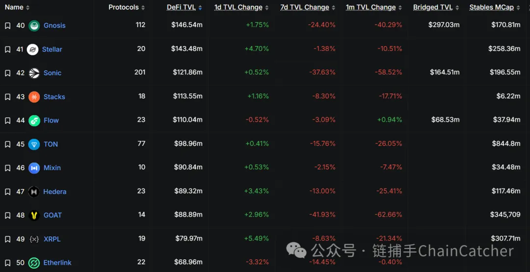 XRPL 公链方面,作为 Ripple 的技术核心,其已服务全球 500 多家金融机构,年化交易量接近 950 亿美元。XRPL 近期升级引入 EVM 兼容侧链,并与 Polygon CDK 合作,提升了智能合约功能。XRPL 的 DeFi 生态相对滞后,DefiLlama 数据显示,XRPL DeFi TVL 仅 7959 万美元(排名第 49),远不及 Solana 101 亿美元和以太坊 747 亿美元等主流公链。