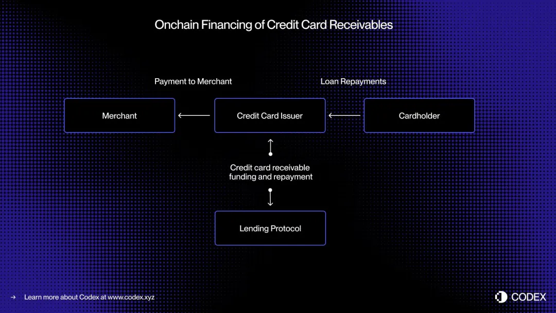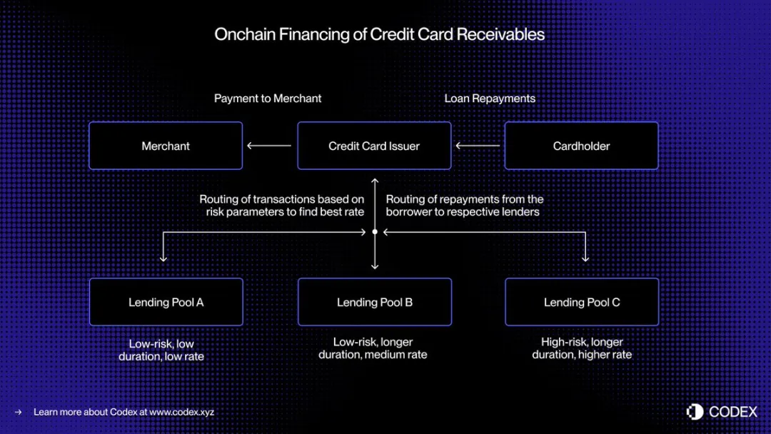 - 设想一位消费者进行一笔 5,000 美元的消费。交易瞬间获得授权。在与 Visa 或 Mastercard 结算之前,发卡行将该应收账款在链上代币化,并从去中心化信贷池中获得 5,000 USDC 的融资。待结算完成时,发卡行将这些资金转给商户。