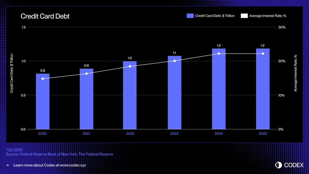 在美国,无抵押借贷的主流形式是信用卡:一种无处不在、流动性强、可即时获取的信贷工具,让消费者在购买时无需提供抵押即可借款。信用卡未偿债务持续增长,目前规模约为 1.21 万亿美。