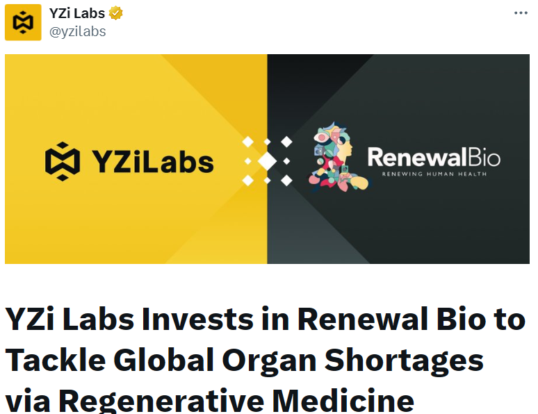 - YZi Labs 投资再生医学公司 Renewal Bio