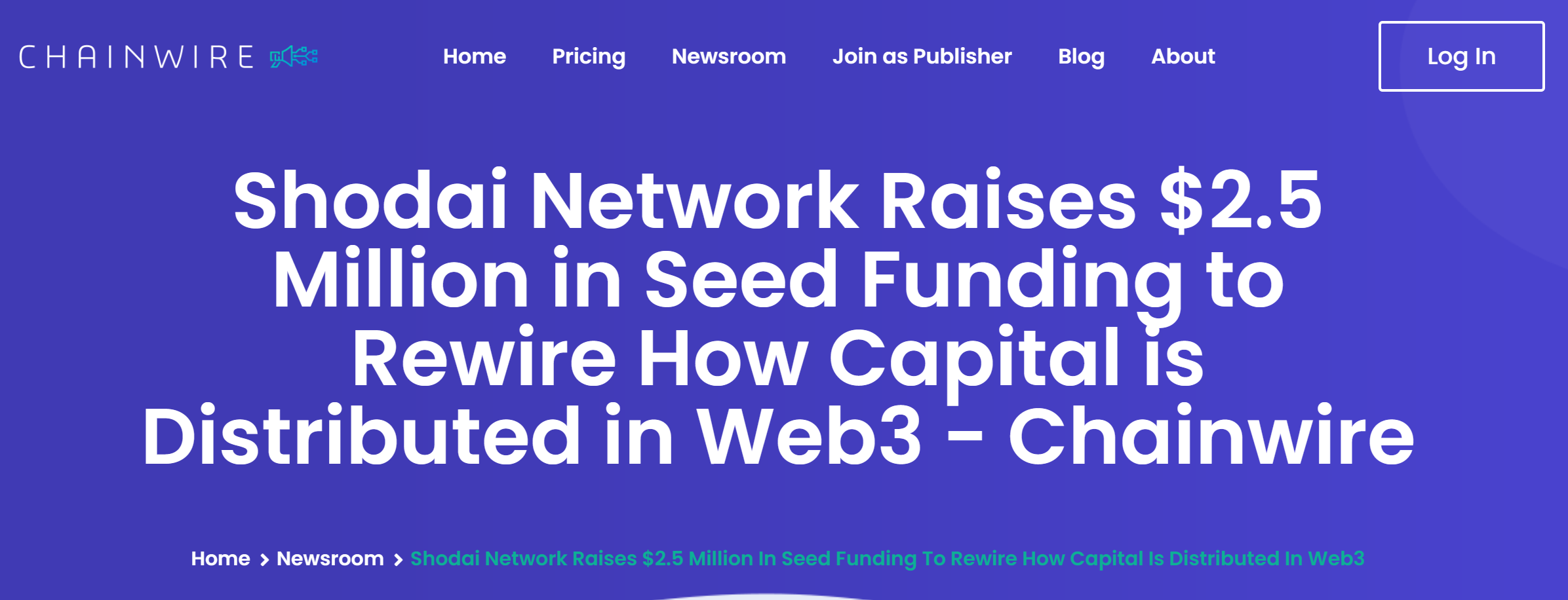 - 加密项目融资平台 Shodai Network 宣布完成 250 万美元种子轮融资