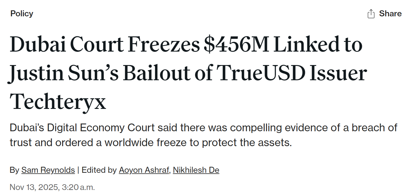 - 迪拜法院冻结与 TrueUSD 发行方 Techteryx 相关的 4.56 亿美元资产
