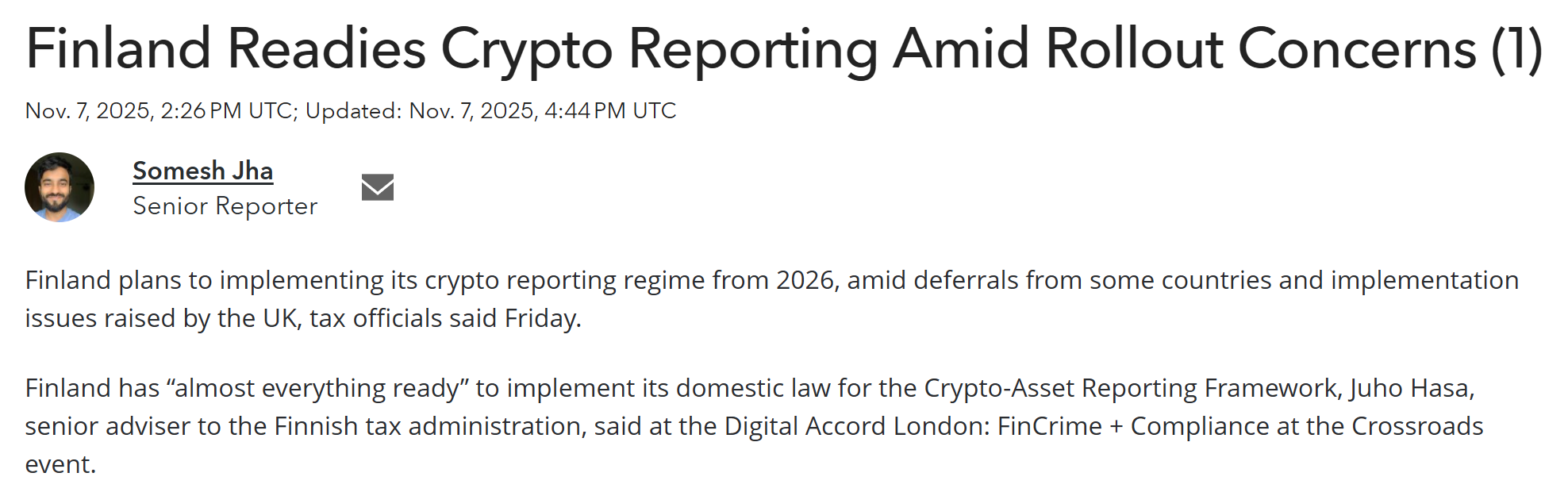 - 芬兰已做好准备从 2026 年开始实施加密货币报告制度
