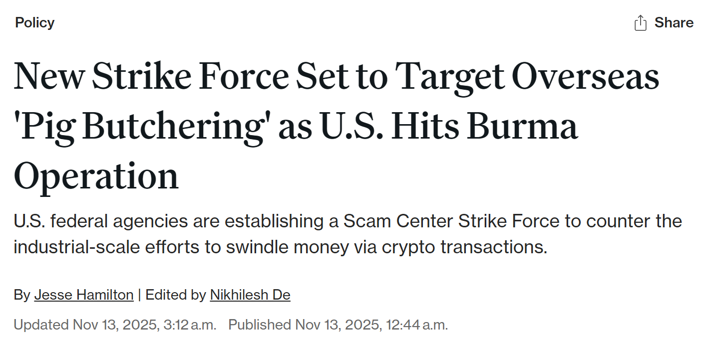 - 美国成立新特别行动组,将打击诱骗加密货币的海外杀猪盘诈骗