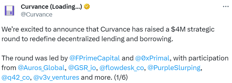 - 借贷协议 Curvance 发推宣布完成 400 万美元战略轮融资,Fprime Capital 与 Primal 领投