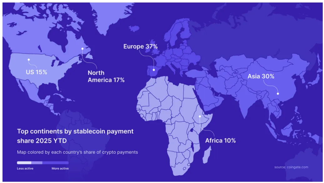 在出金端,变化更为显著:2025 年,CoinGate 平台上 85% 的商户结算都选择了以稳定币形式发放。这表明,对于企业而言,稳定币已不仅仅是另一种支付选项,而是跨境结算、汇款以及 B2B 资金流动中首选的结算层。