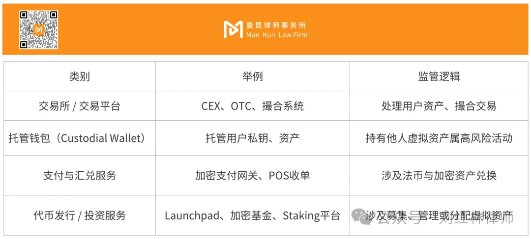 大多数法域对交易所、托管钱包、加密支付、OTC、基金、发行人、支付网关等主体要求取得 VASP 或等效许可,是否需要以当地法为准。