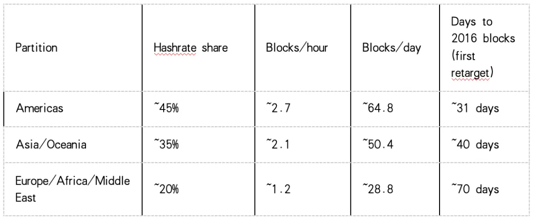 美洲地区每两小时大约会新增 6 个区块,亚洲和大洋洲每小时大约会新增 4 到 5 个区块,欧洲和非洲则每小时大约新增 2 到 3 个区块。