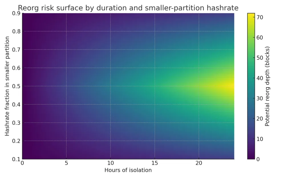 隔离时间越长,弱链的重组风险越深;哪怕只是短暂的 50/50 算力分裂,也可能引发严重的链重组风险。