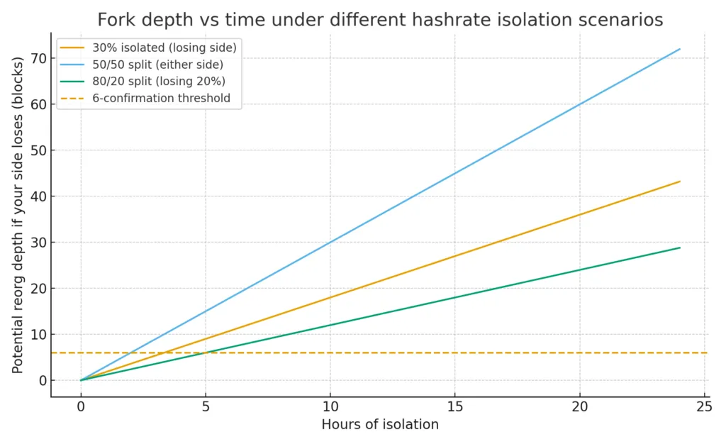 当 30% 的算力被隔离时,少数链每小时大约能新增 1.8 个区块。这意味着在该分区中,一个获得 6 次确认的常规支付大约在 3 小时 20 分钟后就会变得有风险——因为当剩余 70% 的网络构建出更长的主链时,这 6 个区块可能被孤立掉。