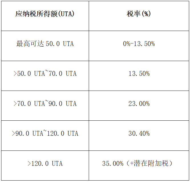 全球补充税实行超额累进税率制度(impuesto progresivo),税率介于 0% 至 40% 之间,具体税阶基于年度税务单位(Unidad Tributaria Anual,UTA)确定。每年由 SII 根据通胀与汇率因素调整 UTA 值。2025 年度的个人所得税税阶如下: