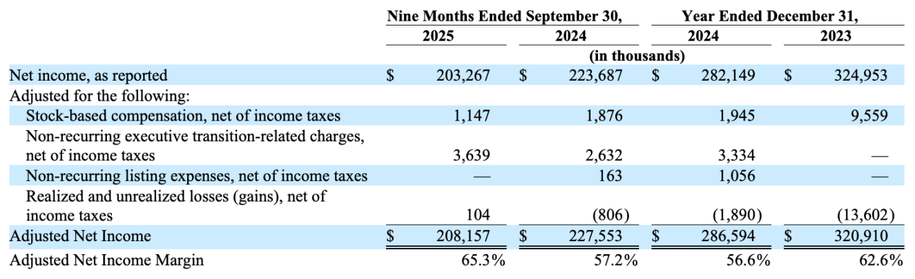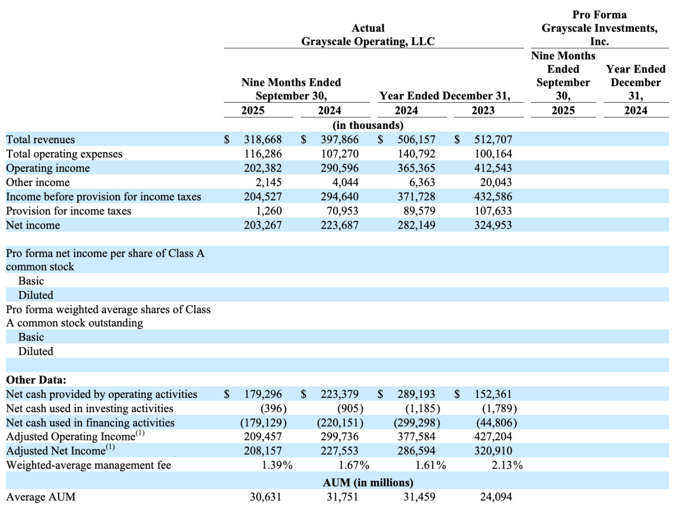 财务表现方面,在截至 2025 年 9 月 30 日的 9 个月内,灰度营业收入约为 3.19 亿美元,同比下降了 20%,营业支出约 1.16 亿美元,同比增长 8.4%,营业利润录得约 2.02 亿美元,同比下降 30.4%。加上其他收入并扣除所得税准备金的净利润约为 2.03 亿美元,同比下降 9.1%。此外,平均资管规模数据显示,今年的资管规模相较去年可能有所下降。