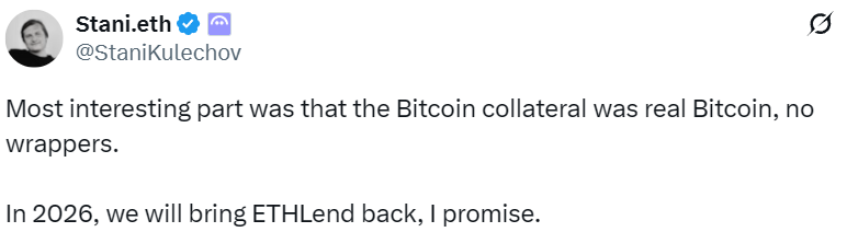 - Aave 创始人:将在 2026 年重新推出 ETHLend