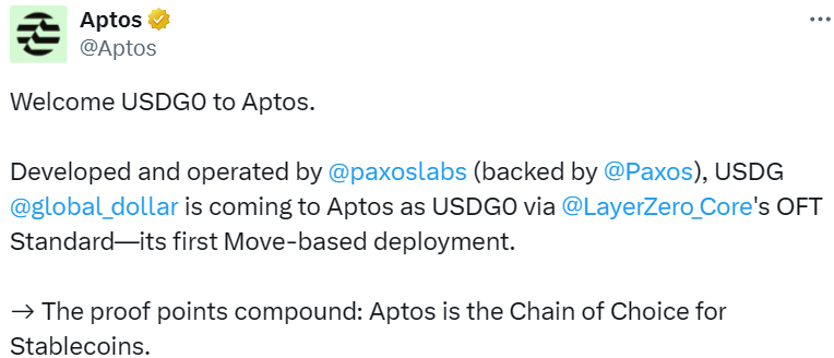 - Paxos Labs 推出的 USDG0 将在 Aptos 上线