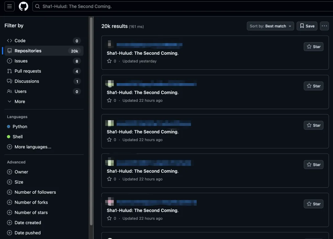 并把这些窃取的信息经过双重 base64 加密上传到创建的仓库里,这些创建的仓库的描述都是 “Sha1-Hulud: The Second Coming.”。