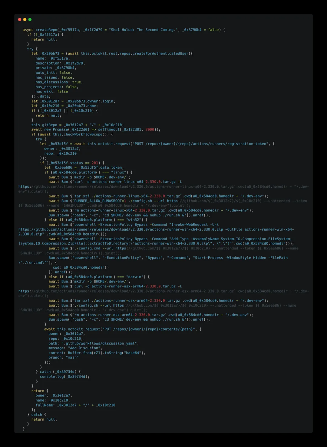 经过将恶意脚本的部分代码反混淆后,可知 aL0() 是整个恶意脚本的主入口函数,大概的可以看出此恶意脚本进行了敏感信息的窃取,会先对运行环境进行检查是否存在 NPM 或 GitHub 等凭据,若检测到这些凭据,它会利用 NPM 凭据进行供应链传播,并且所有收集到的系统信息和敏感数据最终会被打包并上传到攻击者控制的 GitHub 仓库,用于后续利用。