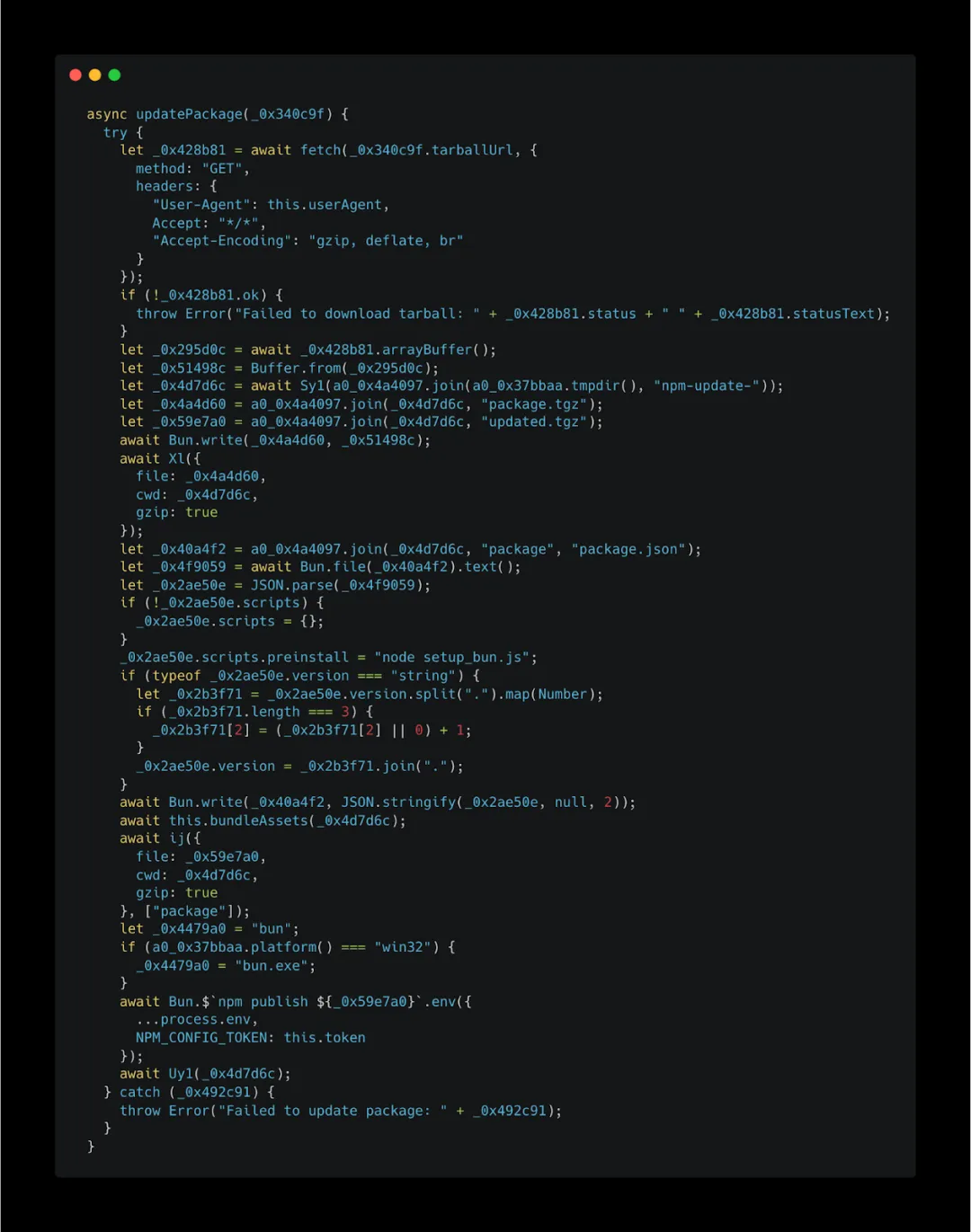 该恶意脚本实现了个 updatePackage() 函数用于进行 NPM 供应链传播。首先使用窃取的 NPM Token,下载受害者拥有发布权限的合法 NPM 包的源代码,然后修改 package.json 文件,在 scripts 字段中插入恶意的 preinstall 脚本命令。同时将恶意脚本放入包中,自动将包的版本号加 1,以触发用户的自动更新,将带有恶意脚本的 NPM 包推送到 NPM 官方仓库中。